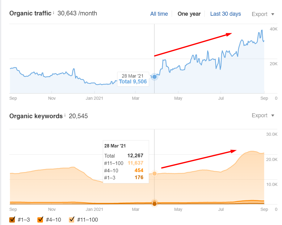 The plan worked to perfection. As you can see on the screenshots below, organic traffic has more than doubled since March! (that was our starting point)