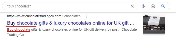 This search operator returns pages that contain an exact match to your query. The word order does not change. If your query is one word, synonyms are excluded. For example, you want just to buy chocolate.