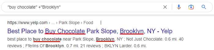 This search operator includes pages that contain a specific word or phrase. Example: for a “buy chocolate” query, you include pages with “Brooklyn”.