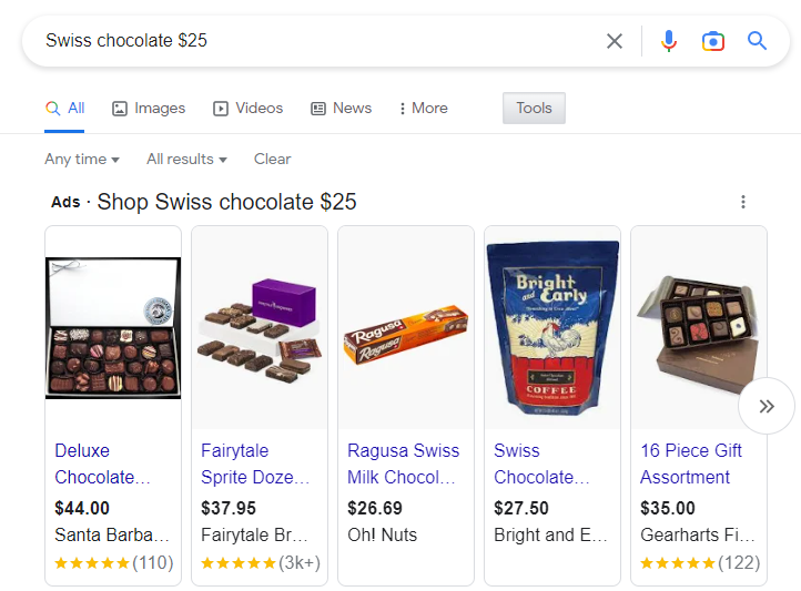 This search operator specifies the price in a chosen currency. For example, you want to find Swiss chocolate for $25 on Amazon.