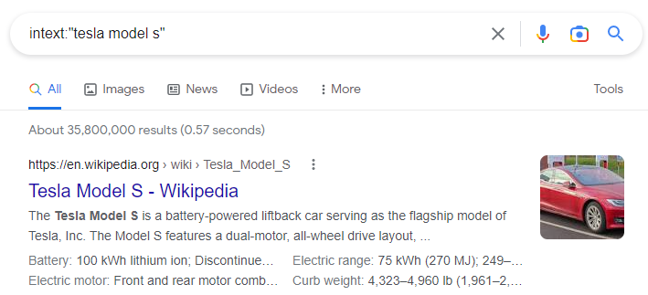 Both search operators return pages whose text contains the requested words. The difference between them is almost unnoticeable, so you can interchange them. For example, you want to use the search operator to find links to a site that contains a Tesla Model S mention.