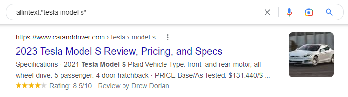 This search operator works just like “allintitle:” or “inurl:” but returns pages with all the specific words in the URL, like in the previous example”site:tesla.com inurl:blog”. Let’s use the previous example where you want to search for a blog about Tesla. In this case, the amount of search results will noticeably decrease.