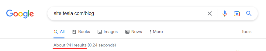 When analyzing their activity, you should have a clear idea of how many indexed pages your competitors have. Use the “site:” advanced search operator to find it out. Let’s see how many indexed pages Tesla’s blog has.