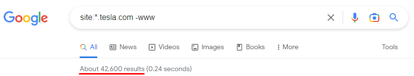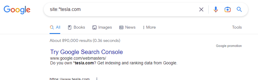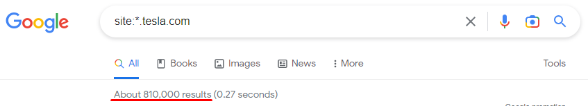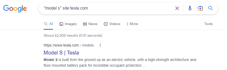 This search operator returns search results for a specific domain. This Google Search command is mainly used to see the approximate number of indexed pages. For example, you want to see how many indexed pages Tesla has with Model S mentions.