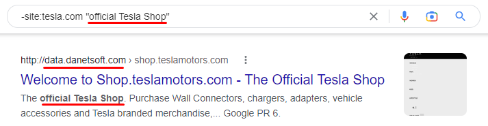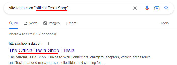 However, you may want to find something outside the site. Who knows, maybe Tesla’s competitors “borrowed” the text? Let’s use the following search operators.