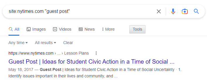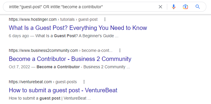 This search operator returns results where both specified words or phrases are present on the page. Using individual words does not make sense since Google does this by default (like dark AND chocolate). This search command is recommended to use with other Google Search modifiers. For example, you want to find guest posting options on food blogs to promote your chocolate business.