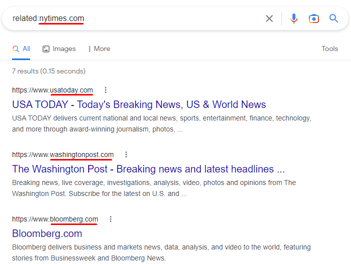 This search operator returns search results for related resources. It basically shows competitors’ websites with similar content. For example, you want to find Tesla’s competitors (mostly for SEO purposes).