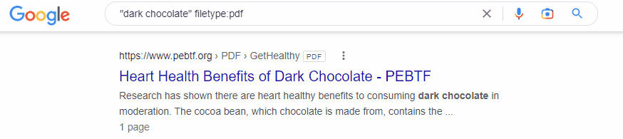 This search operator returns pages with specific Google Search file extensions like pdf, docx, txt, ppt, and so on. This search command works the same as the “ext:” search operator. For example, you want to google search only pdf pages about dark chocolate.