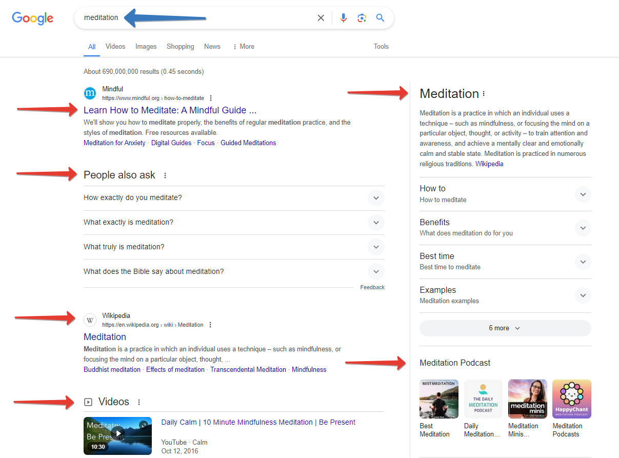 Searches for “dog training” could mean anything from basic obedience to specialized skill training to correction of certain behaviors. The intent spectrum is wider. Similarly, “meditation” leaves more open to the interpretation of form, purpose, or specific benefits sought.