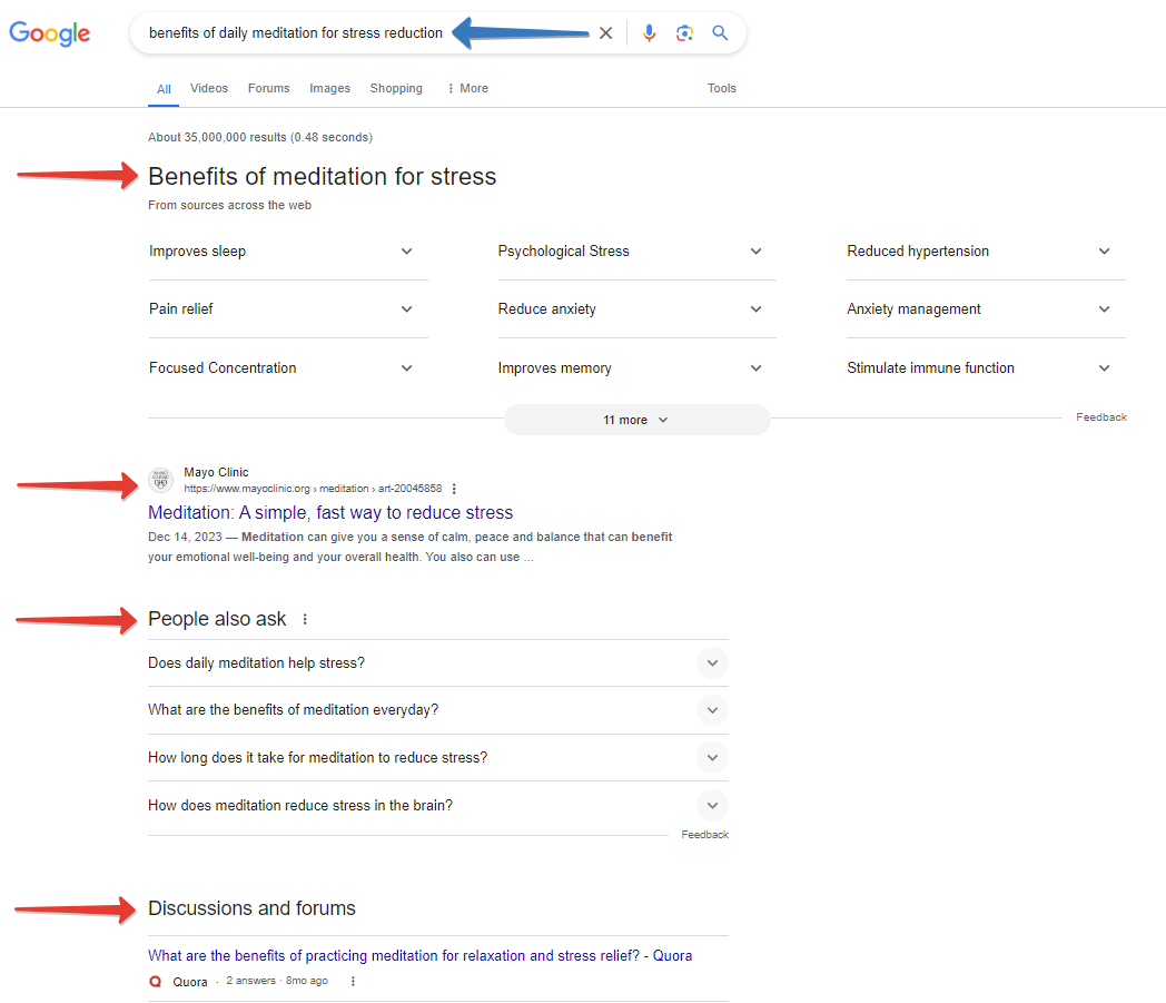 Because long-tail keywords offer more parameters, search volumes tend to be lower, but conversion rates are much higher for matching content. If someone searches “meditation benefits,” that could signify a range of interests. But “benefits of daily meditation for stress” shows clear intent that content meeting that specificity will better address the searcher’s needs.